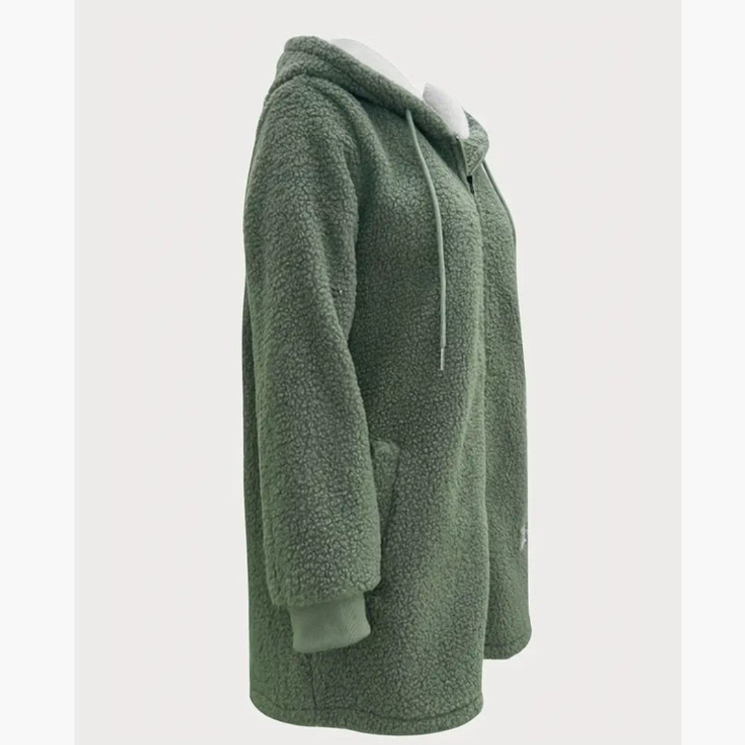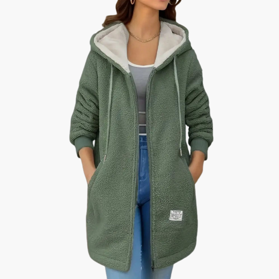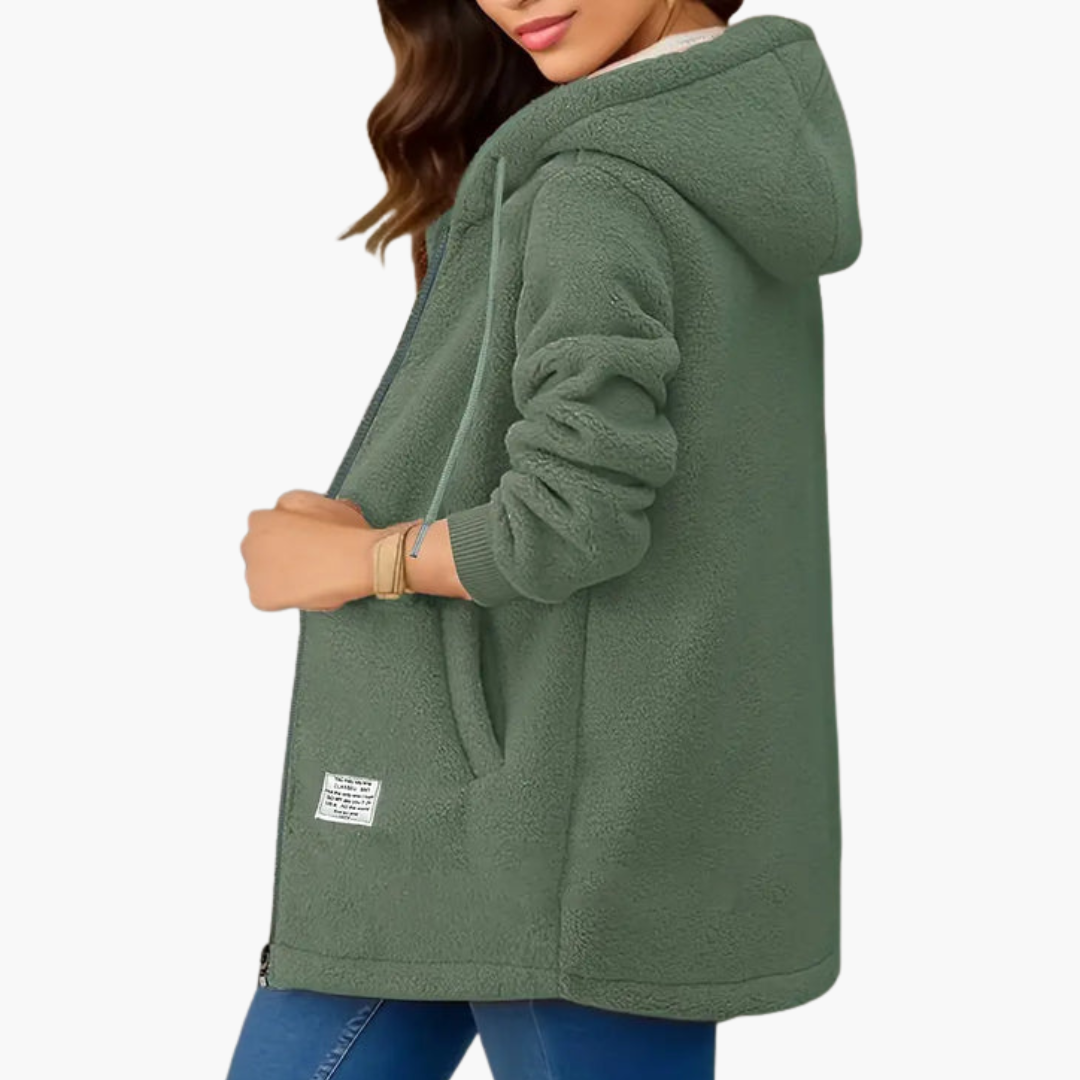 Model z pełnym zamkiem z przodu i regulowanym kapturem ze sznurkiem. Wykonana z materiału typu polar, posiada długie rękawy i dwie boczne kieszenie. Średnia długość i prosty krój sprawiają, że nadaje się do noszenia w chłodniejsze dni.