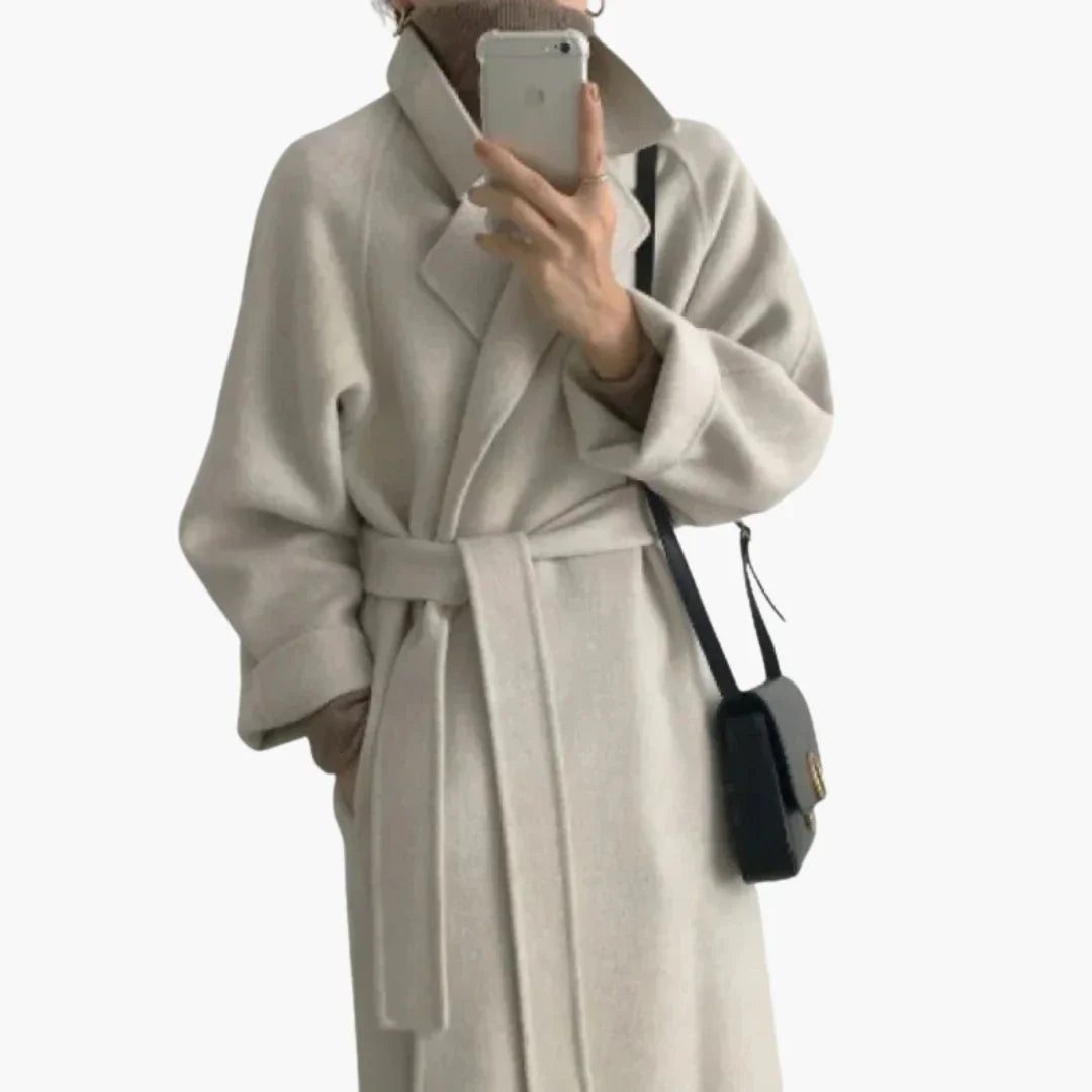 Długi płaszcz damski z paskiem i szerokimi rękawami