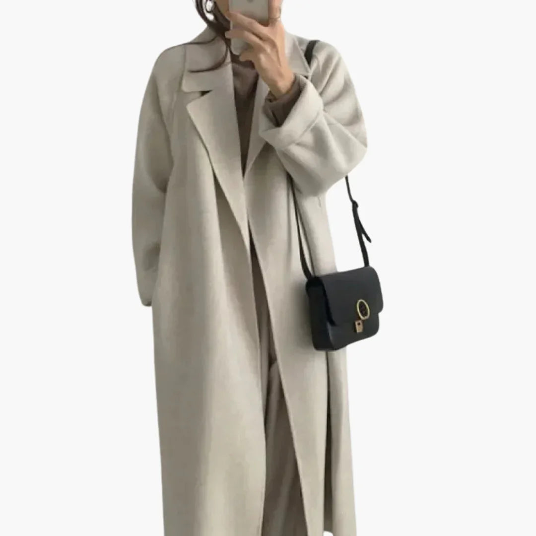 Ten płaszcz damski ma szerokie klapy i pasek w talii umożliwiający regulację. Zawiera długie szerokie rękawy, głębokie boczne kieszenie oraz prosty krój sięgający do połowy łydki. Powierzchnia ma wygląd przypominający wełnę, odpowiedni do noszenia w chłodniejsze dni.