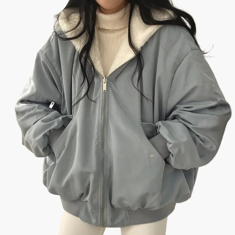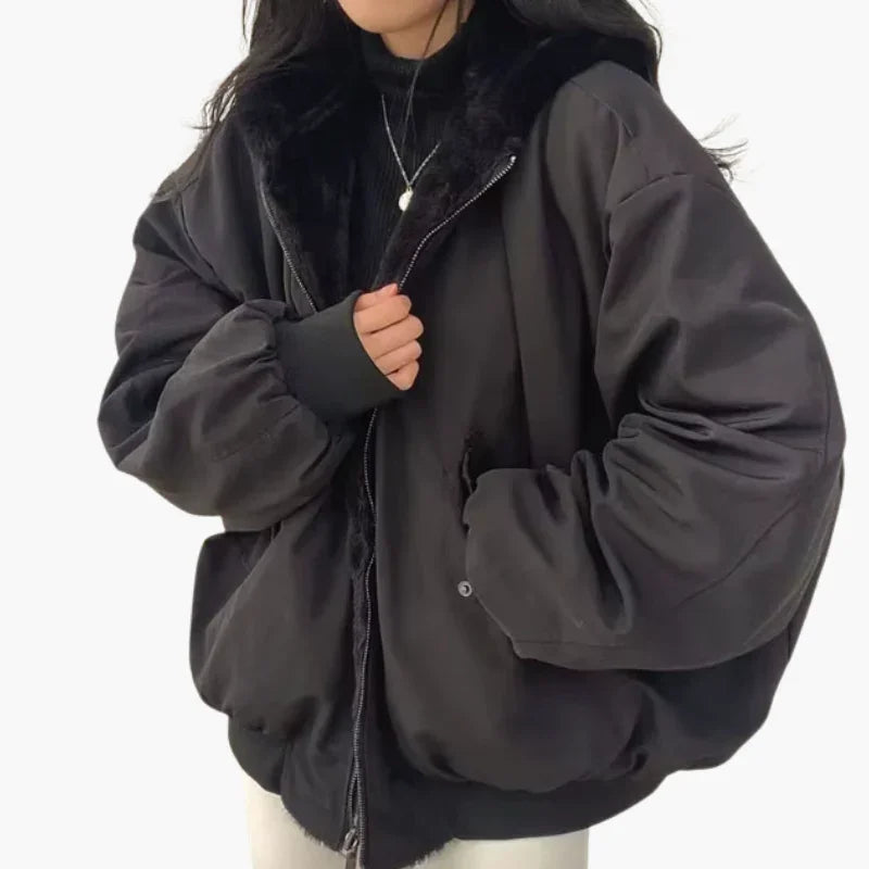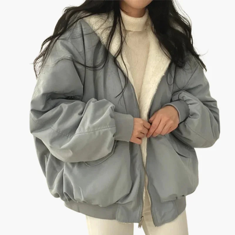 Ta odwracalna kurtka zimowa łączy nowoczesny wygląd z funkcjonalnym krojem na chłodniejsze dni. Wnętrze wykonane z materiału imitującego owczą skórę dodaje przytulnego charakteru, a zewnętrzna warstwa o gładkim wykończeniu uzupełnia zimowe stylizacje. Luźny krój, elastyczny dół i szeroki kołnierz tworzą harmonijny wygląd podczas codziennych spacerów i wyjść w chłodne dni.