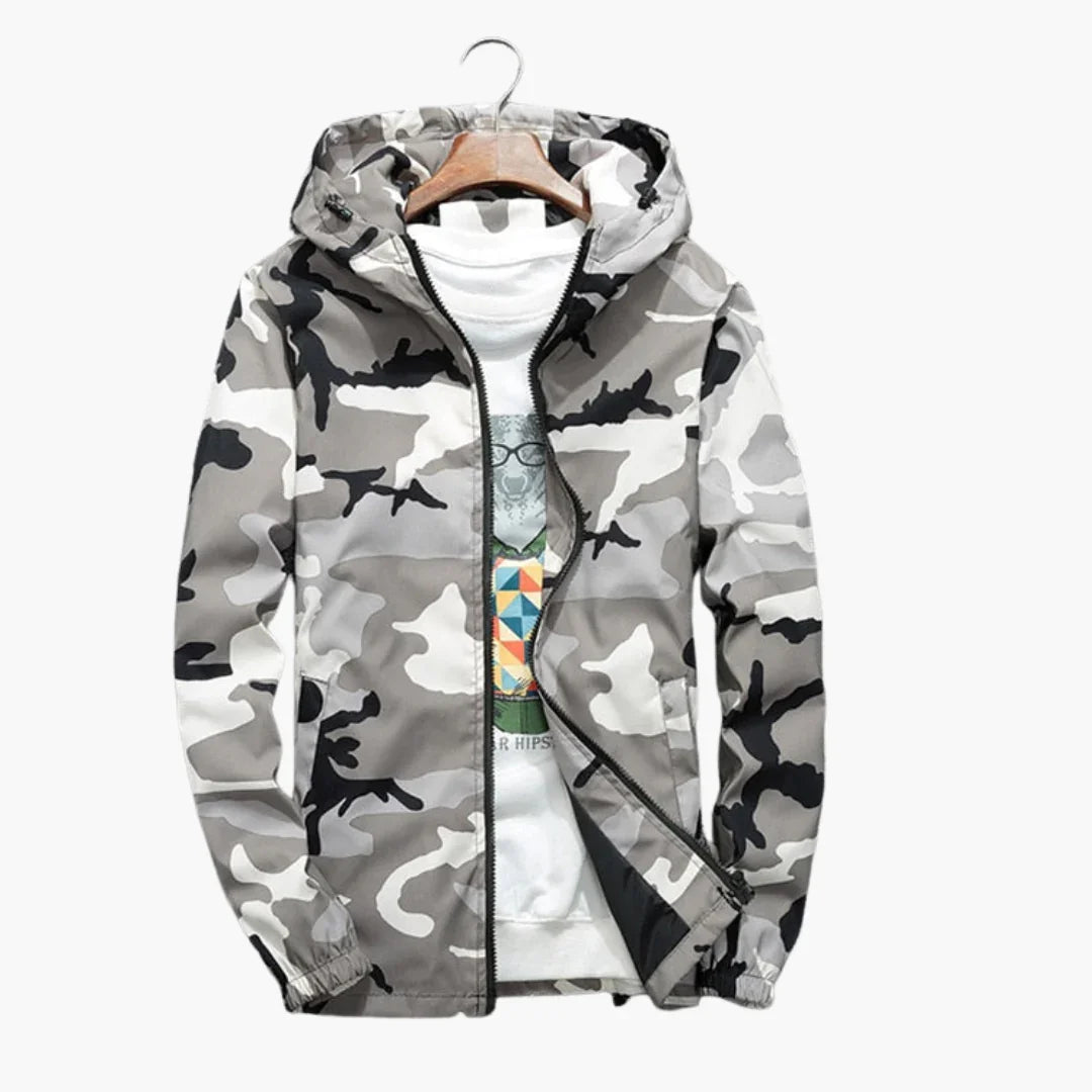 Męska kurtka z kapturem w kamuflażowym wzorze z przednim zamkiem błyskawicznym