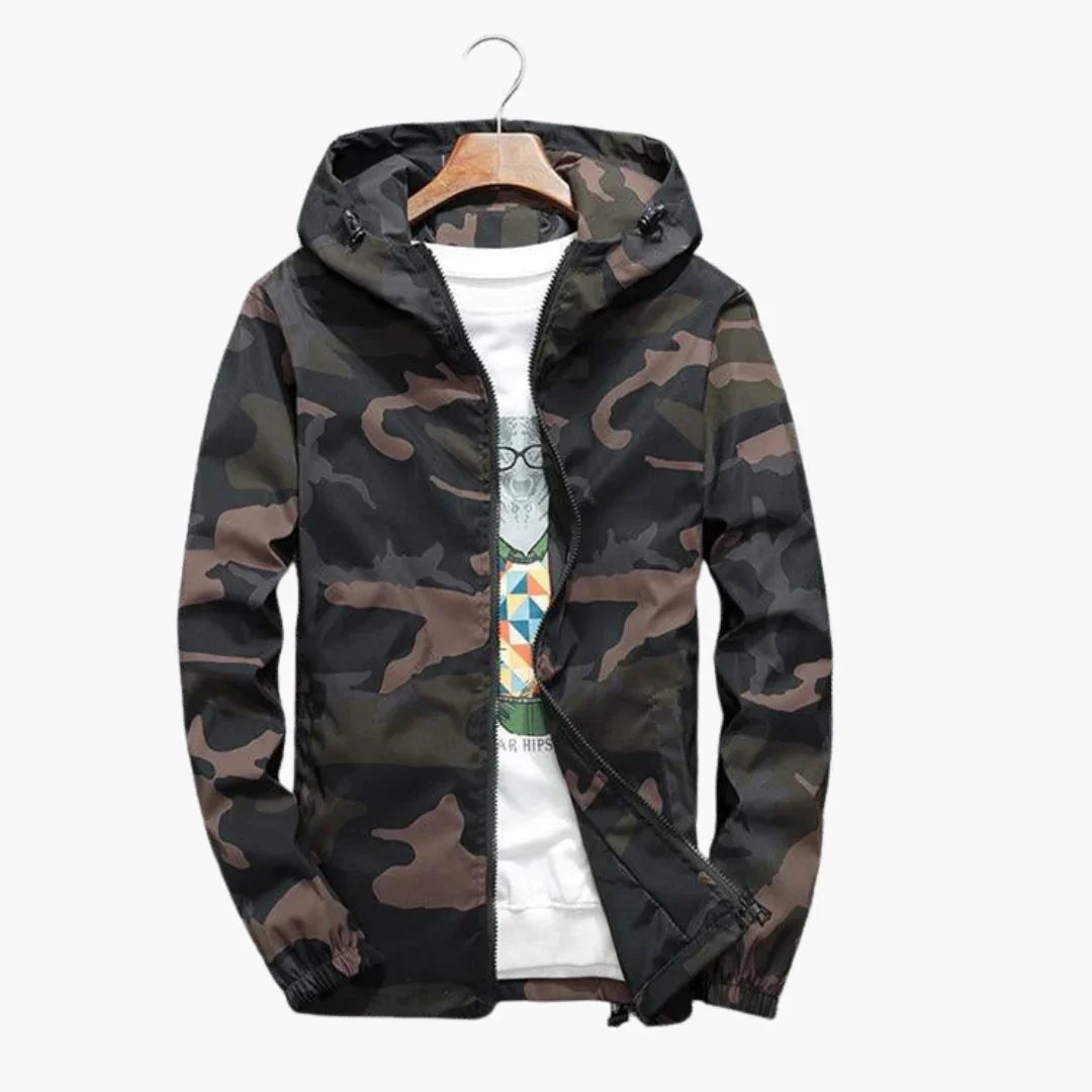 Męska kurtka z kapturem w kamuflażu i przednim zamkiem błyskawicznym