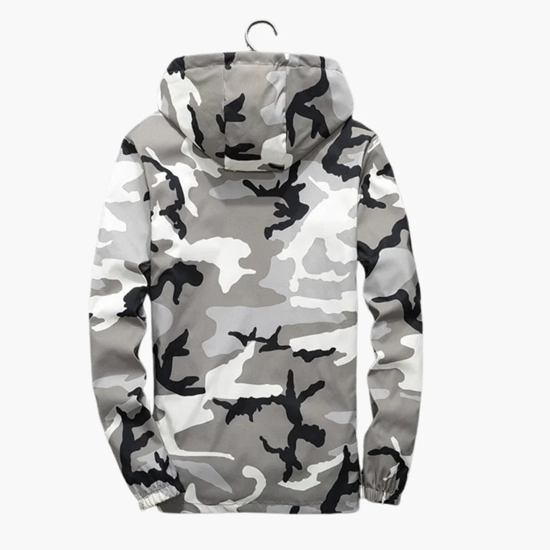 Ta męska kurtka z kapturem ma kamuflażowy wzór oraz zamek błyskawiczny na całej długości. Kaptur można dopasować za pomocą sznurka, a długie rękawy zakończone są elastycznymi mankietami dla pewnego dopasowania. Tkanina o gładkiej strukturze sprawdza się w okresach przejściowych oraz podczas aktywności na zewnątrz.