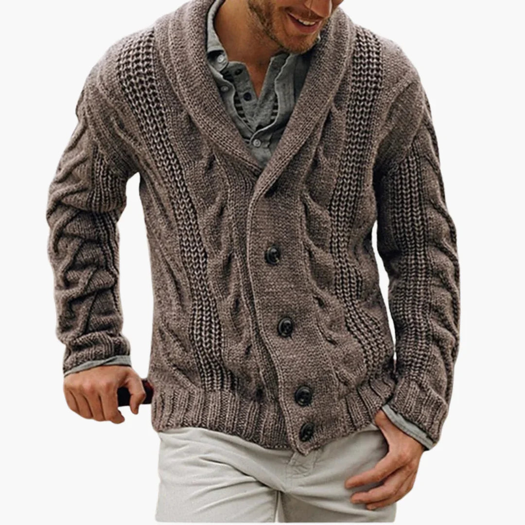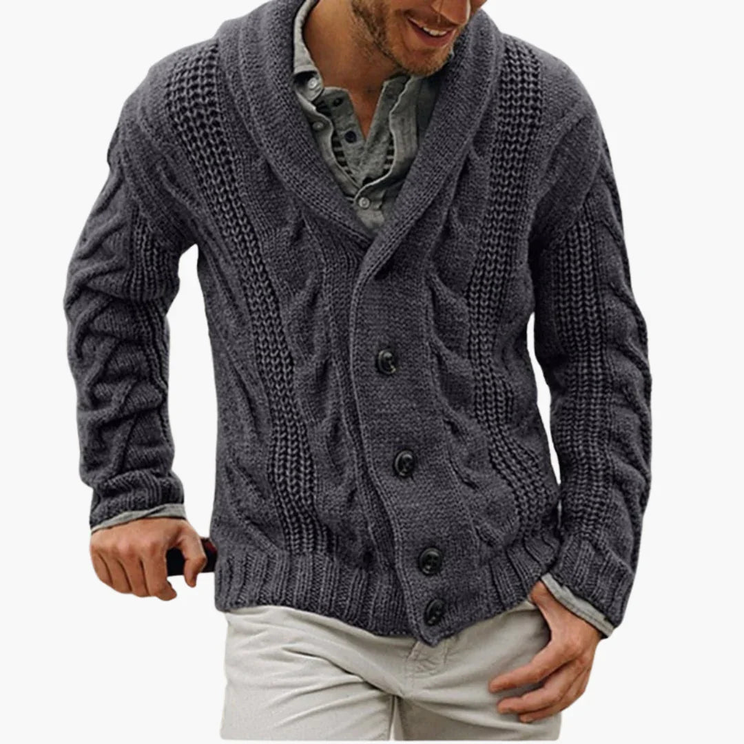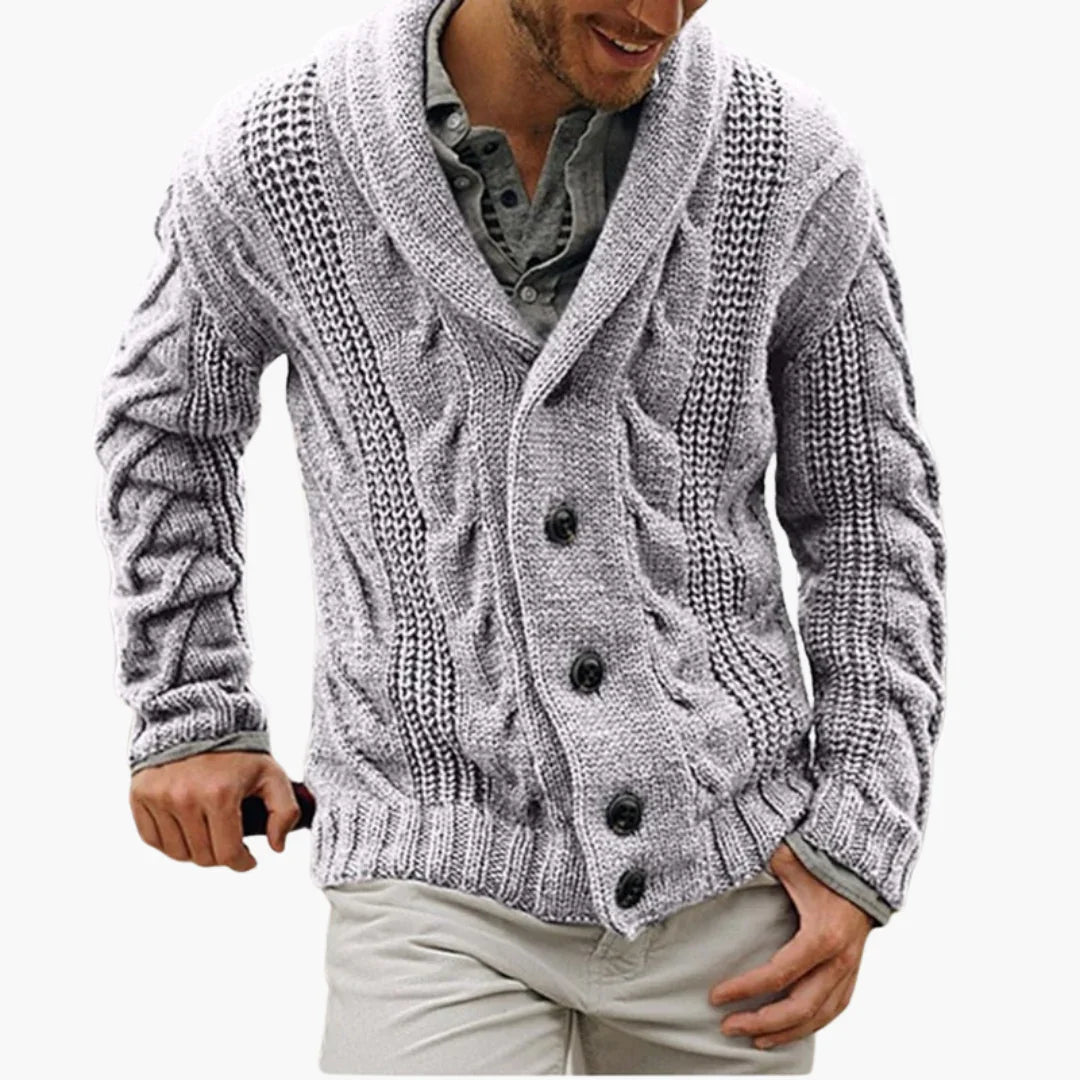 Męski kardigan o grubym splocie z kołnierzem szalowym i zapięciem na guziki z przodu