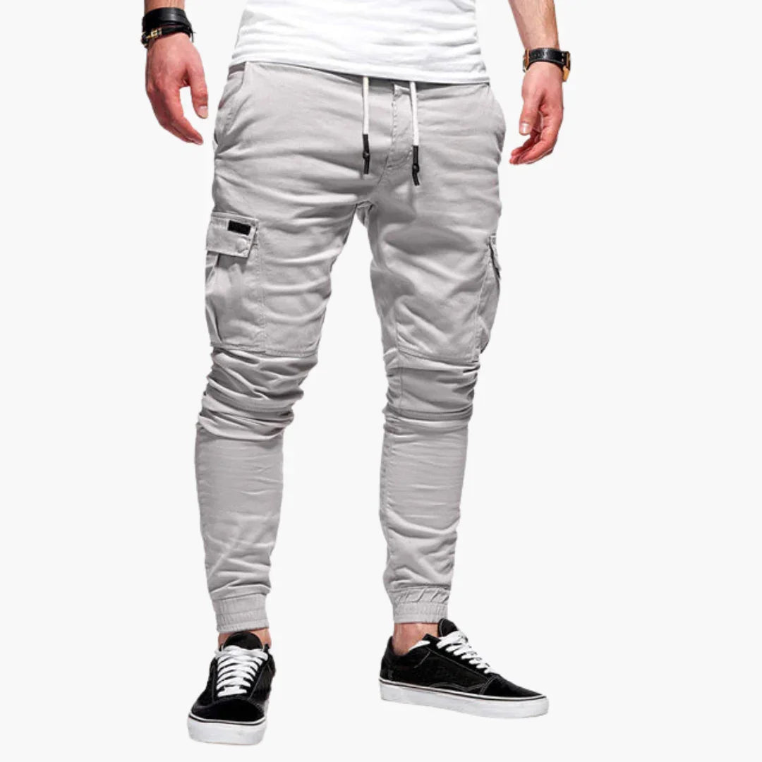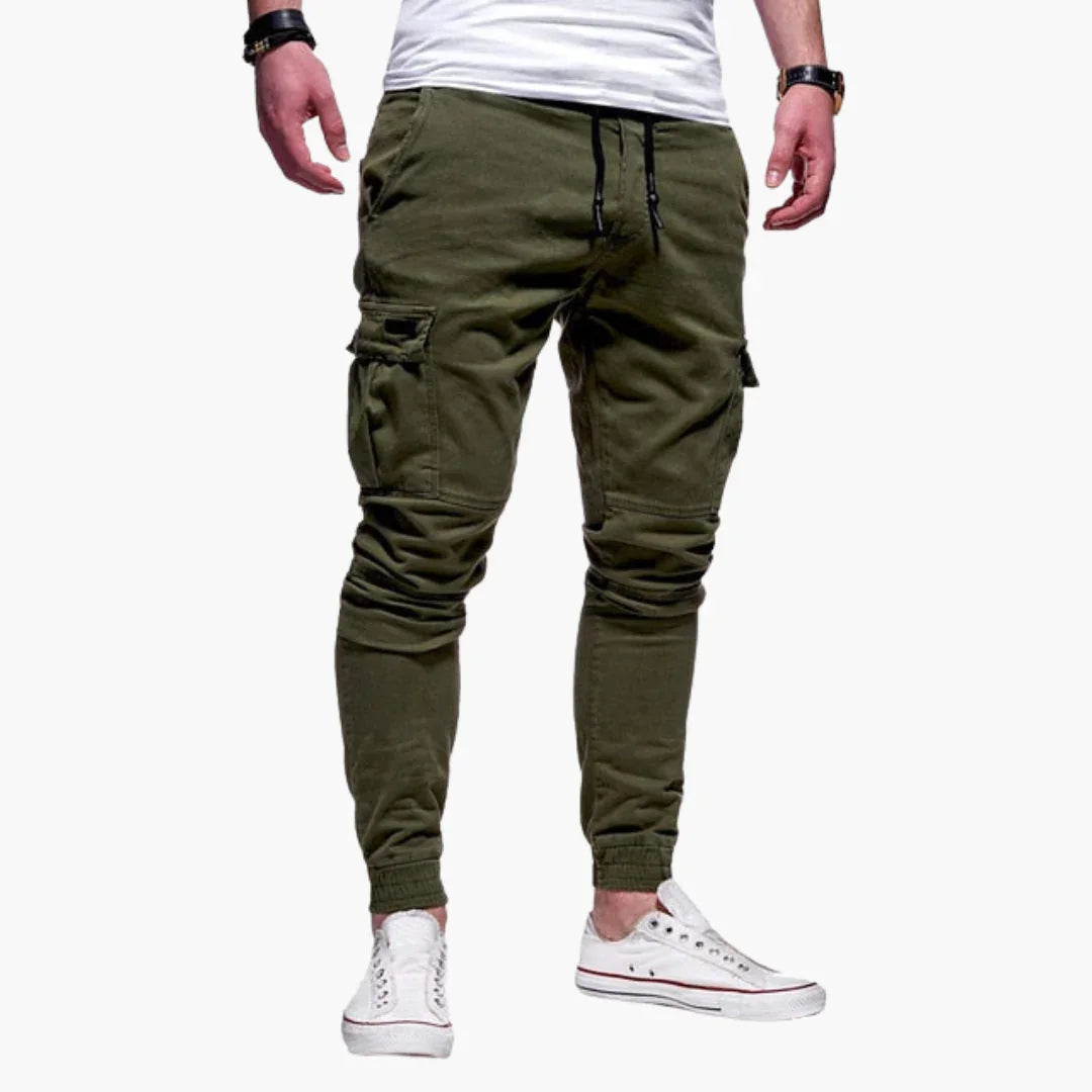 Te męskie spodnie jogger mają elastyczny pas z regulowanym sznurkiem oraz kilka kieszeni, w tym boczne kieszenie cargo. Nogawki zwężają się ku dołowi i kończą elastycznymi mankietami. Materiał ma jednolitą strukturę, nadającą schludny wygląd odpowiedni na co dzień.